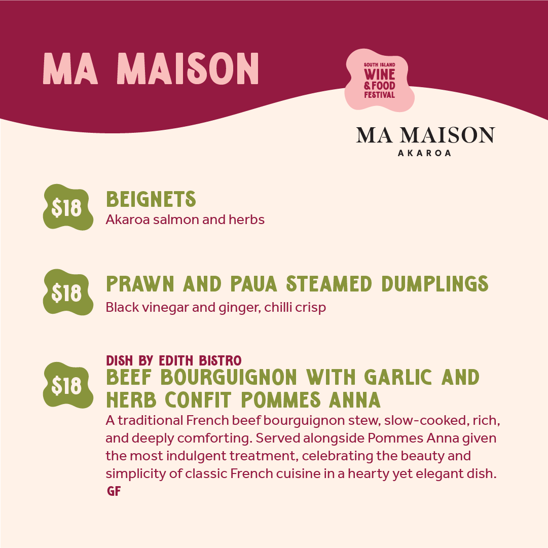 Ma Maison brings the flavours of Akaroa to the festival with French-inspired dishes full of coastal charm. Their menu celebrates freshness and simplicity, using locally sourced ingredients to create home-cooked meals worth leaving your house for. Enjoy plates that capture the spirit of their harbour front restaurant, from comforting favourites to coastal delights. Ma Maison delivers a taste of Akaroa you won’t want to miss.