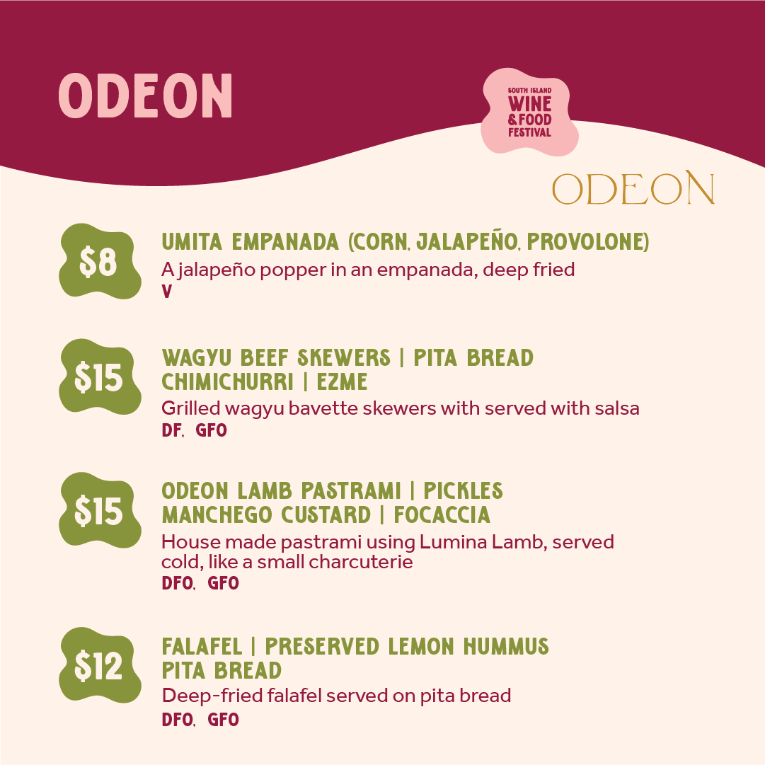 Odeon serves Mediterranean-inspired dishes with a Kiwi twist, bringing big flavours and seasonal produce to the festival. Shared plates take you on a journey through nostalgic flavours and new experiences, perfect for tasting and sharing. Their carefully curated wine list features unique, story-driven bottles from passionate producers. Odeon combines delicious food, fantastic wine, and a welcoming vibe for an unforgettable festival stop.