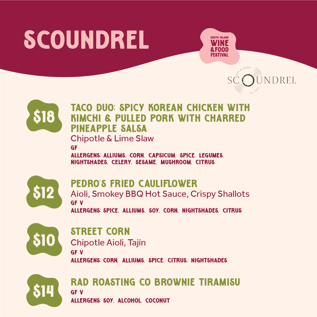 Scoundrel serves tacos, playful plates, and plenty of attitude in a laid-back, Eastside eatery vibe. Bite-sized corn tacos, fresh coffee from their in-house roaster, and a huge selection of wine and beer make every visit a treat. With room to lounge, a welcoming atmosphere, and space for everyone, it’s the perfect festival stop for friends, family, and furry mates alike. Scoundrel brings fun, flavour, and comfort to every plate.