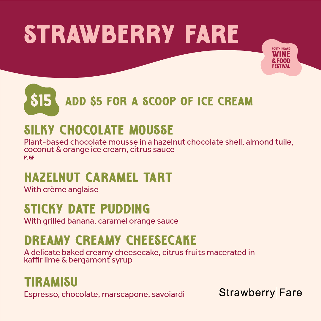 Strawberry Fare is Christchurch’s dessert icon, serving show stopping sweets and seasonal treats at the festival. Using fresh, local ingredients, every dish balances rich and refreshing flavours, with gluten-free and vegan options for everyone. Indulge in decadent desserts crafted to delight both the eyes and the palate. Strawberry Fare is the ultimate stop for a sweet festival fix.